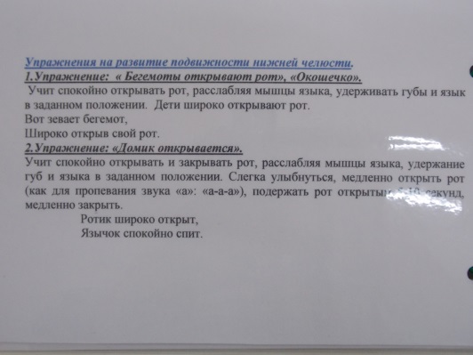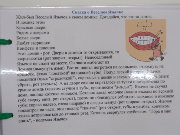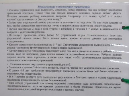 а веранде участка логопедической группы был оформлен уголок для проведения такой нетрадиционной формы артикуляционной гимнастики. Педагоги как коррекционной группы, так и групп общеразвивающей направленности, могут пользоваться данным пособием на прогулке индивидуально или с небольшой подгруппой детей из 2-3 человек, закрепляя выполнение уже выученных с детьми упражнений. Для проведения артикуляционной гимнастики педагог обязан знать и владеть методикой, знать цель каждого артикуляционного упражнения и уметь чётко и правильно выполнять все упражнения комплексов. В помощь педагогам изготовлены красочные рекомендации с подробными инструкциями по выполнению упражнений, картинками, стихотворной формой к каждому упражнению, сказками о весёлом Язычке.