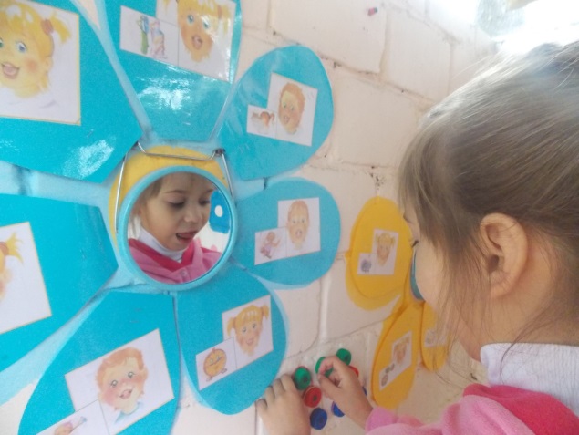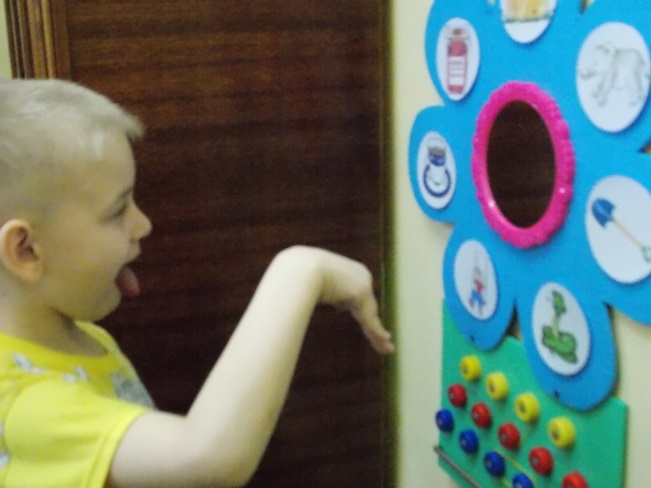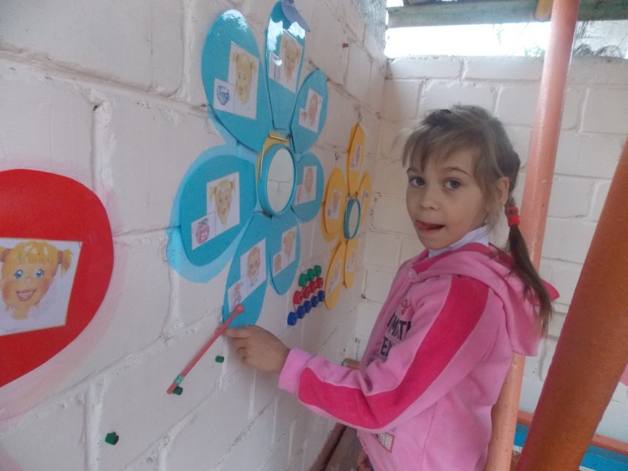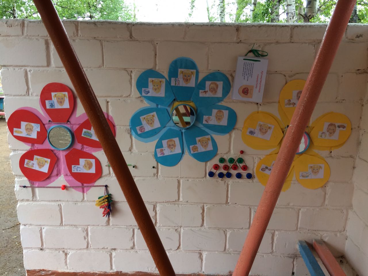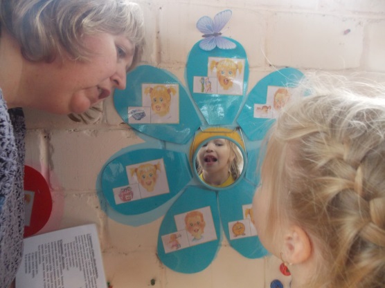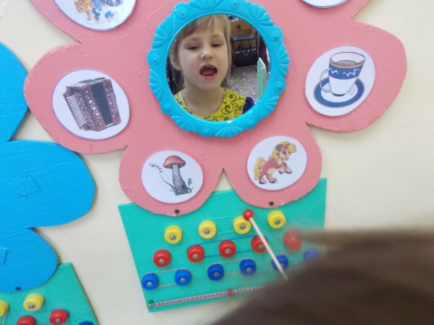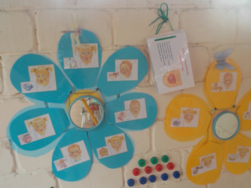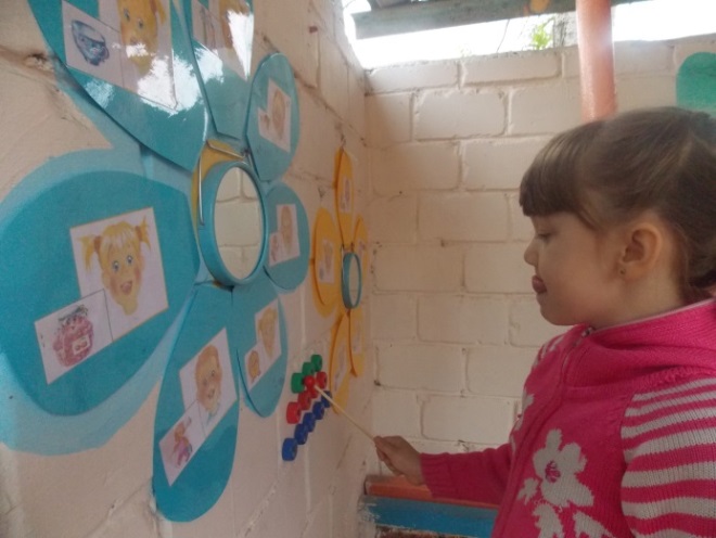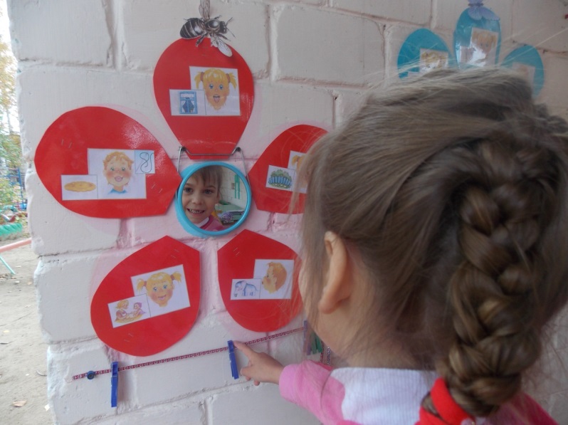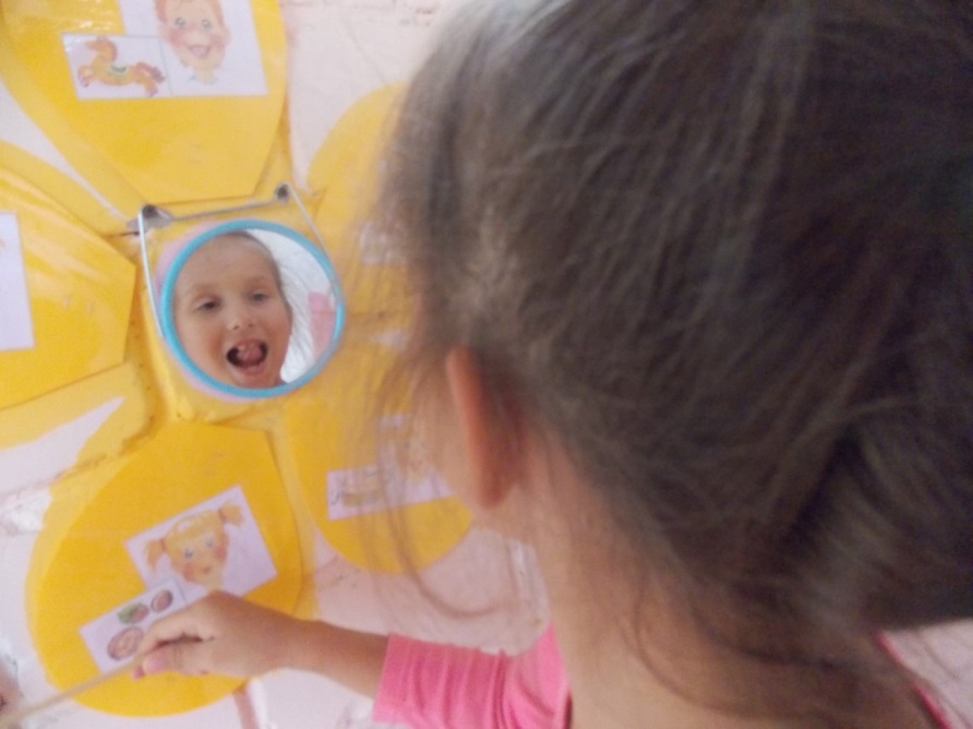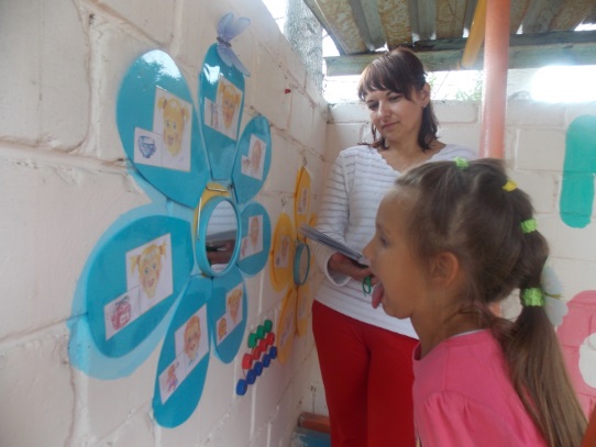 ниманию детей предлагается изображение трёх цветов, нарисованных на стене веранды. В начальный период артикуляционную гимнастику необходимо выполнять перед зеркалом. Ребенок должен контролировать положение своих органов артикуляции. С этой целью в центре каждого цветка расположены съёмные зеркала. На каждом съемном цветочном лепестке, крепящемуся на липучку, изображена картинка, соответствующая названию упражнения, и артикуляционный уклад. Упражнения распределены от простого к сложному. На лепестках первого цветка изображён начальный комплекс статических и динамических упражнений. На втором и третьем цветах предлагаются более сложные динамические упражнения. Изображения бабочки, стрекозы и пчёлки показывают порядок выполнения упражнений на каждом цветке.