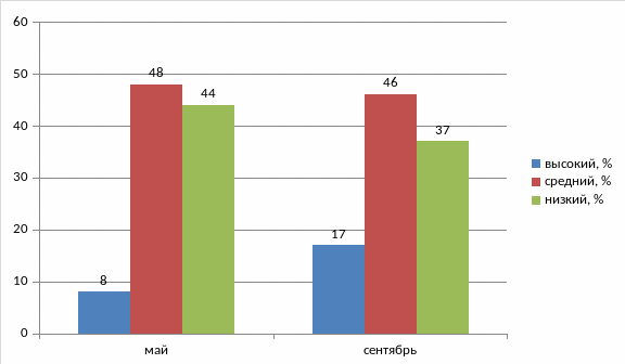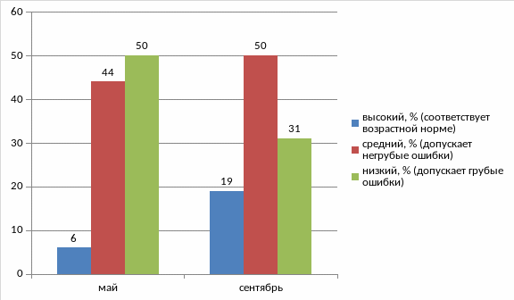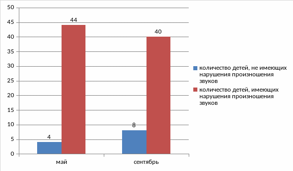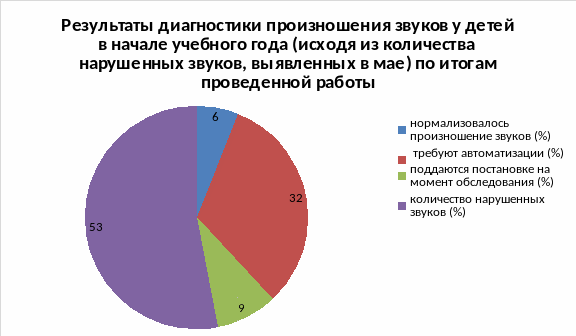 Результаты итоговой диагностики в конце учебного года выявили нарушения звукопроизношения из у 44 человек (92%) в количестве 192 нарушенных звука (отсутствие, искажение, замена). На момент обследования в начале учебного года после проведенной в летний период работы по развитию артикуляционной моторики количество детей с нарушениями звукопроизношения уменьшилось до 40 человек (83%). Из 192 нарушенных звуков, выявленных в мае, нормализовано произношение 11 звуков (6%), поддаются постановке в процессе обследования 18 звуков (9%), требуют автоматизации 61 звук (32%), нарушено произношение 102 звуков (53%).