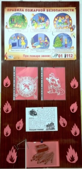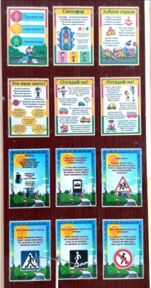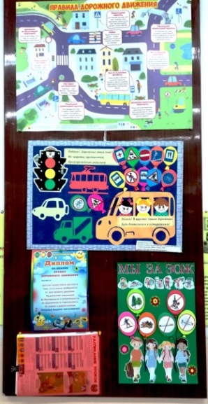 Фото 2 - постоянно действующие выставки по ПДД и пожарной безопасности, расположенные на стендах в мастерской. На стендах размещаются и творческие работы данной тематики, которые постоянно обновляются.