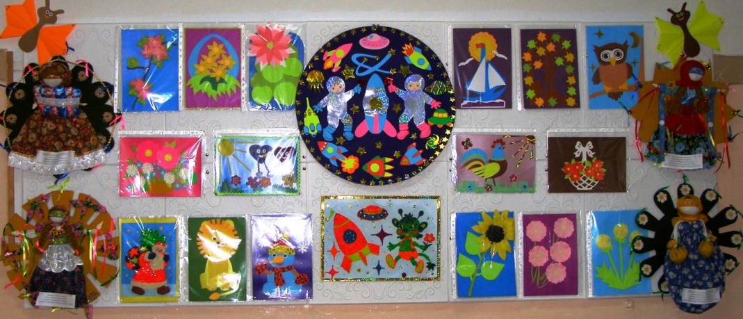 Фото 1- пример постоянно действующей выставки творческих работ обучающихся в мастерской. Экспозиция поделок меняется регулярно. Это очень важно разнообразить образовательную среду, стимулировать обучающихся к творчеству.