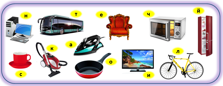 Выбери буквы, которые расположены возле электроприборов и собери из них слово. Укажи изображение полученного слова.