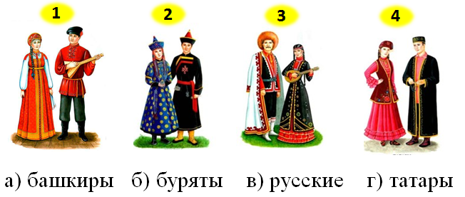 оедини народы, проживающие на территориии России, и их костюмы. Выбери верный вариант ответа.