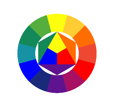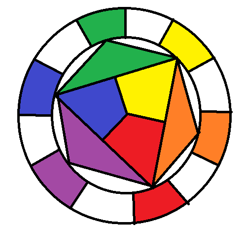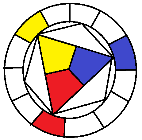 В центре есть треугольник из основных цветов — синего, жёлтого и красного - смешивая которые, можно получить любые оттенки, доступные человеческому глазу.