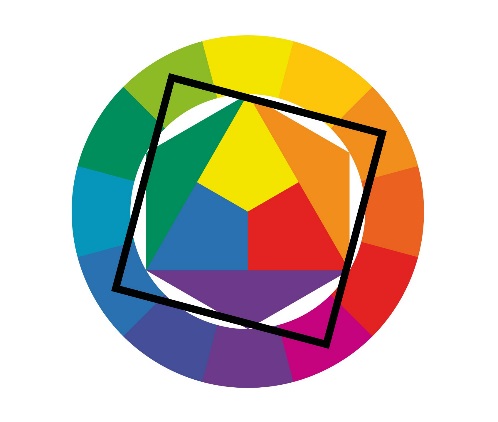 5. Когда трёх цветов недостаточно, можно выбрать четыре. Например, квадрат, наложенный на круг Иттена, образует сочетание тетрады: все четыре цвета гармонируют между собой.