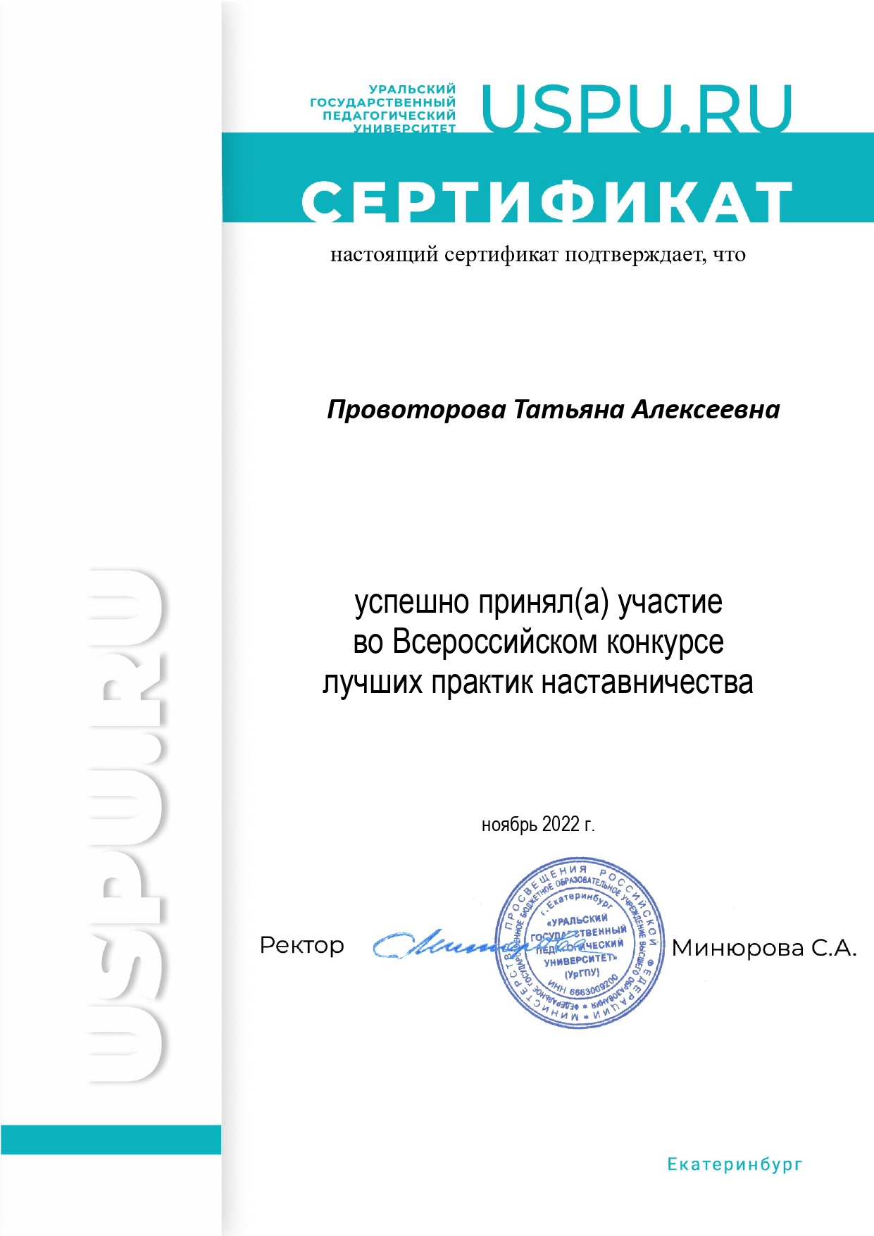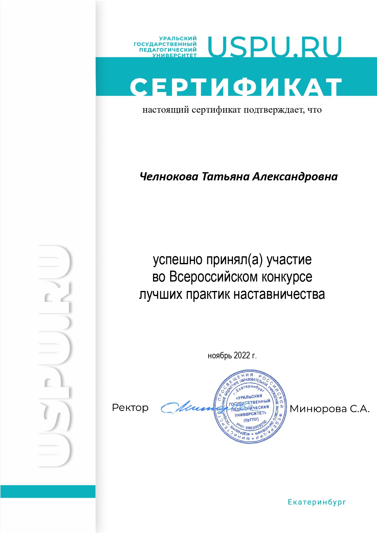 Наш проект уже успешно принял участие во Всероссийском конкурсе лучших практик наставничества, который проводился в октябре-ноябре 2022 года Федеральным государственным бюджетным образовательным учреждением высшего образования «Уральский государственный педагогический университет». Это подтверждено сертификатами.