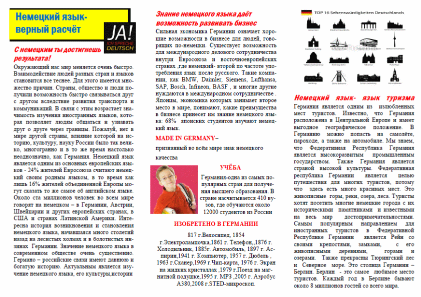 В буклет мы поместили краткую информацию по основным вопросам, которые были изложены в данной работе. Буклет и анкеты будут использоваться при проведении мероприятий, связанных с проблемой актуальности немецкого языка в современной жизни с целью вызвать интерес и желание к изучению немецкого языка и проанализировать мотивацию выбора иностранного языка