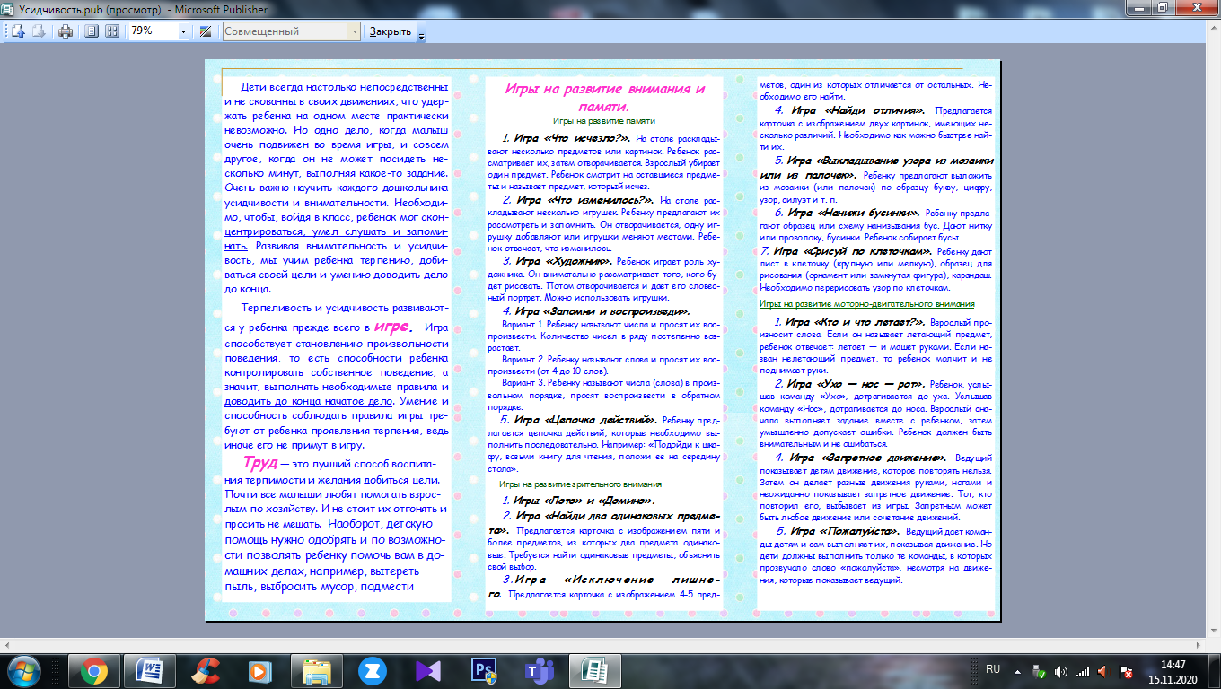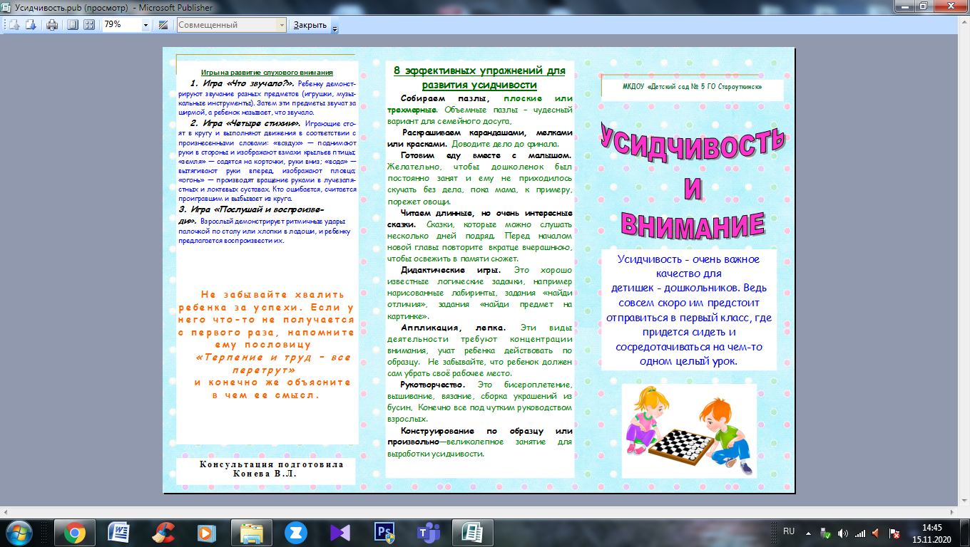 15.11.2020 Консультация для родителей "Усидчивость и внимание" Принять участие в этом конкурсе Описание конкурса Список всех конкурсов Конева Виктория Леонидовна МКДОУ "Детский сад № 5 ГО Староуткинск" Конкурсная работа Свидетельство участника экспертного совета жюри Свидетельство можно заказать сразу, как Вы оставите не менее 3 объективных комментариев в этом разделе сайта. Узнать подробнее Презентация экспериментальной деятельности во второй младшей группе "Сладости, опасные для здоровья" «Развитие связной речи детей дошкольного возраста» У вас недостаточно прав для добавления комментариев.Чтобы оставлять комментарии, вам необходимо авторизоваться на сайте. Если у вас еще нет учетной записи на нашем сайте, предлагаем зарегистрироваться. Это займет не более 5 минут.