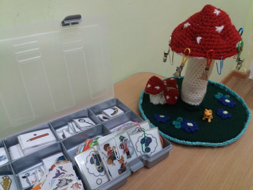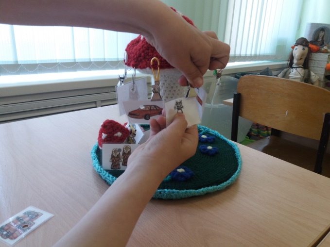 Ход игры: три картинки из предложенных, которые находятся на прищепках на большом мухоморе имеют один и тот же автоматизируемый звук, а четвертая картинка этот звук не имеет. Дети выбирают лишнюю картинку, объясняя свой выбор.