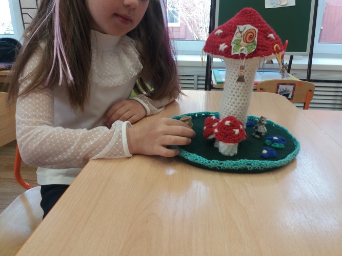 Данное пособие выполнено в технике вязания крючком, подобранны насыщенные цвета (гриб «мухомор»- яркий и запоминающий: один большой гриб и три вместе растущих-маленьких, находящихся на зелёной полянке с цветами), высота пособия 22см, что удобно в работе с детьми, можно переносить в любое место, удобен в хранении.