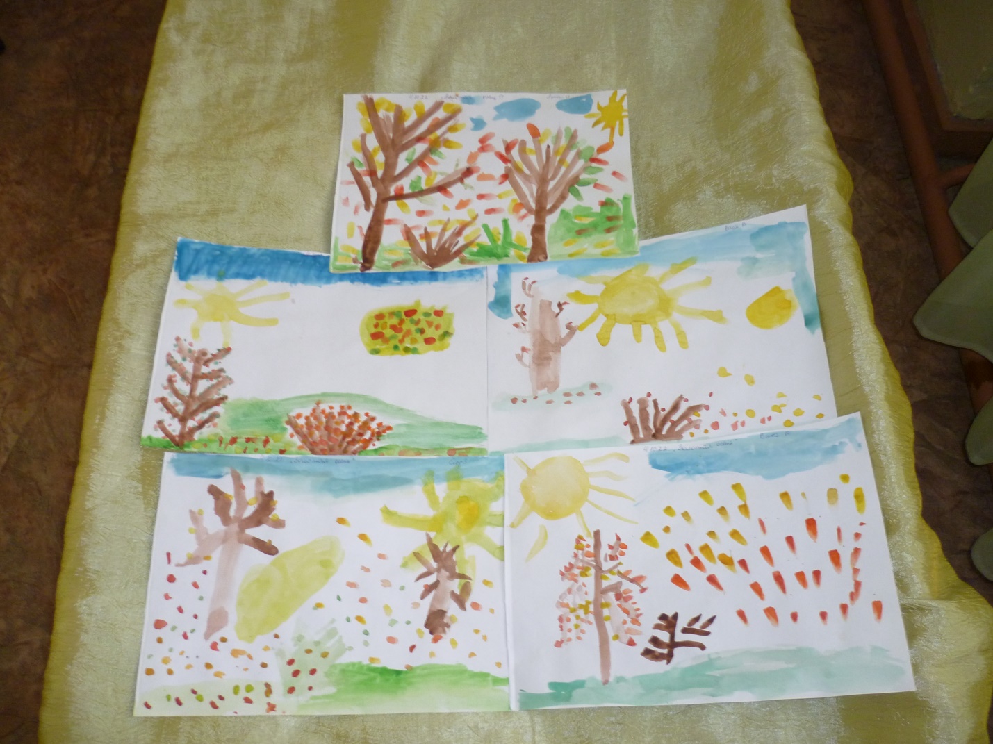 Воспитатель: Какие красивые рисунки у вас получились. Теперь я поняла, что осень вам нравится. А какие красивые слова вы можете сказать про осень?