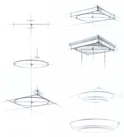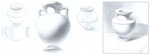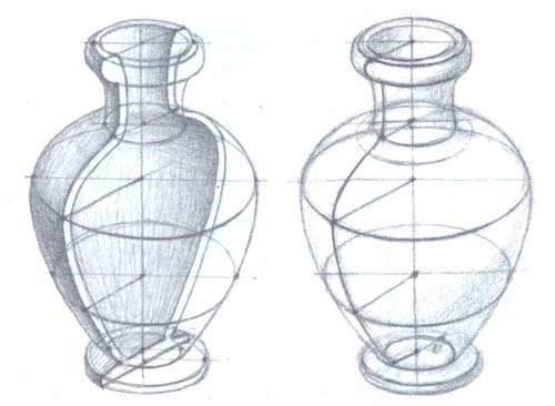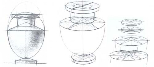 Таким образом, по намеченным точкам основных положений частей вазы намечают легкими линиями ее общую форму. Наметив характер формы, следует перейти к передаче объемно-пространственной конструкции вазы. Передача объемно-пространственной характеристики предметов тел вращения возможна лишь при правильном построении их образующих окружностей (эллипсов). Построение эллипсов следует производить с учетом закономерностей перспективы.
