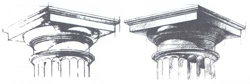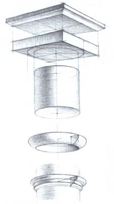 Капитель состоит из трех основных частей. Верхняя часть, абака, представляет собой толстую квадратную плиту, которая венчается каблучком и полочкой. Под ней находится эхин, затем - переходная к колонне часть, состоящая из трех поясков или шейки, которая сопрягается со стволом колонны. Чуть ниже имеется выступающий валик с полочкой, называемый астрагалом, который также сопрягается со стволом колонны через выкружку. Если мысленно представить капитель без мелких элементов: эхина с поясками, астрагала с полочкой и без рельефа выкружки, то нетрудно определить, из каких геометрических форм состоит ее основа. Разумеется, ствол колонны состоит из цилиндра, а абака - из толстой квадратной плиты, расположенной симметрично по центру на верхнем основании цилиндра. При отдельном рассмотрении ее дополнительных элементов можно видеть, что профиль эхина близок к четвертному валу, а астрагал представляет собой тело, образованное движением шара по окружности на некотором удалении от поверхности цилиндра, с примыкающей к нему снизу полочкой.