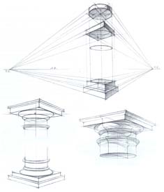 Построение конструкции капители можно начинать с квадратного основания абаки или с окружности верхнего основания четвертного вала. Здесь главное - верно построить в перспективном ракурсе два соединяющих элемента. Но, как показывает длительная практика, преобладающее большинство студентов сталкивается с трудностями при вписывании окружности в квадрат (эллипса в ромб). Необходимо отметить, что строя квадрат в перспективе, с тем чтобы потом вписать в него окружность (эллипс), нужно помнить, что независимо от положения углов плиты относительно точки зрения и ее ракурсов, эллипсовидная окружность должна быть всегда построена строго в горизонтальном положении с учетом перспективных сокращений. Причем середина каждой из сторон квадрата плиты должна касаться окружности (эллипса). Недопустимо пытаться подогнать изображение эллипса к неправильно построенному квадрату. Это приведет к значительным искажениям, как самих элементов, так и всего изображения.