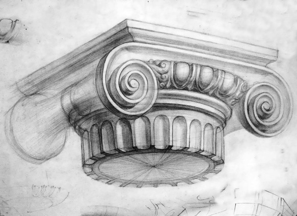 При изображении половинчатой формы капители студенты часто забывают, что это - часть целого. Следовательно, чтобы получить правильное изображение половины капители, необходимо произвести полное построение изображения, а не только его видимой части. Только после этого можно приступать к определению половины капители в соответствии с ее положением относительно рисующего. Чтобы произвести необходимое вертикальное сечение, следует, с учетом перспективы, разделить пополам эллипсы оснований, а затем и основание квадрата плиты-абаки. После проверки и дополнительных уточнений ненужную половину можно слегка ослабить, но не избавляться от нее сразу, так как при дальнейшей проработке и уточнениях на нужной половине могут быть допущены некоторые искажения. Таким образом, непременным условием завершения работы над построением рисунка капители является проверка на расстоянии. Только с определенного расстояния можно увидеть те или иные недочеты. Особое внимание необходимо обратить на пропорции, перспективу, характер, объемно-пространственную форму и общее состояние рисунка. После уточнения построения и исправления допущенных ошибок, следует перейти к выявлению объемной формы светотенью. Для начала необходимо наметить границы собственных и падающих теней, а затем нанести легкий тон на теневых участках с последующей постепенной проработкой светотени на всем изображении и вокруг него, постепенно приводя рисунок к определенной степени завершенности.