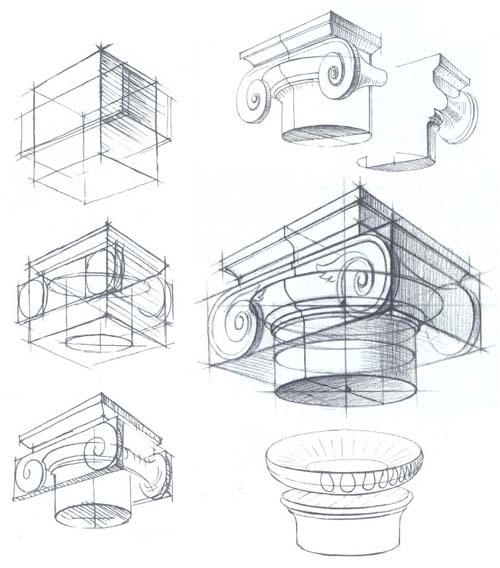 Построение изображения начинают с общей формы. Учитывая, что ее основу составляют тела вращения, вначале следует определить общую вертикальную ось капители, а затем приступить к перспективному построению изображения. При изображении классических ордеров чрезвычайно важно с самого начала как можно точнее выдержать основные пропорциональные величины. От того, насколько правильно будут определены основные размеры капители, будет зависеть правильность соотношения величин остальных ее элементов.