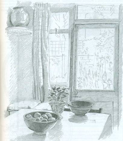 Однако есть две потенциальные проблемы. Во-первых, если комната маленькая, скорее всего, трудно будет найти идеальное место для мольберта, поскольку необходимым условием является направление света. Необходимо, чтобы свет падал и на ваш рисунок, а не только на сам предмет. Во-вторых, многие интерьеры обязаны своим особым очарованием специфическому эффекту освещения. Спальня с утренним солнечным светом, струящимся по приведенным в беспорядок простыням, – прекрасная тема, но она станет менее соблазнительной, когда солнце “уйдет”. Поэтому, если вы не обладаете невероятно точной визуальной памятью, то возможно, стоит использовать фотоаппарат, применяя фотографию как справочную информацию для фиксации игры света и обращения к реальным вещам в уточнении структуры, пропорций и деталей. Это именно тот случай, когда цифровая камера действительно незаменима, поскольку не придется ждать дни или недели, пока не будет отснята вся пленка; ведь тем временем можно и потерять первоначальное вдохновение.