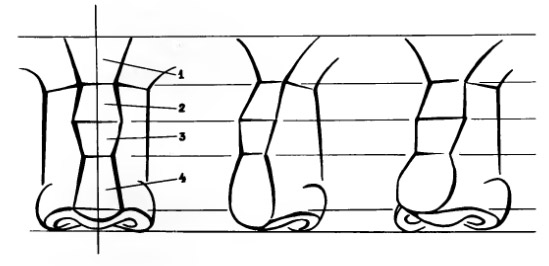 Внешний вид и закономерность формы носа в основном зависят от особенностей строения костей носа и лобного участка между бровями. У курносого лобный участок сильно выдается вперед, а носовая кость вдавлена. У людей с прямым носом переход от лобных костей к горбине носа плавный. У человека с орлиным (мефистофельским) носом лобная кость несколько выступает, а кости носа сильно выдаются вперед и резко опускаются книзу. Отсюда закономерность расположения хрящей и мышц. Это надо будет учитывать при рисовании живой головы. В данном случае нам надо усвоить общую закономерность строения формы носа и его пластическую характеристику.