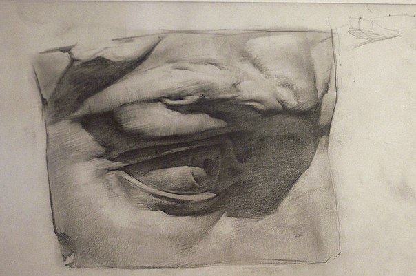На данном этапе работы происходит детальная характеристика натуры: выявляется фактура модели, передается материальность предметов (гипс, ткань) рисунок тщательно прорабатывается в тональных отношениях.