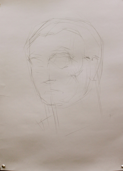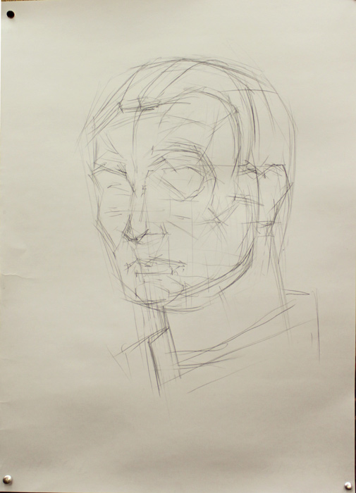Элементы, находящиеся к нам ближе, сразу лучше намечать чуть контрастнее, чем части, находящиеся дальше. За счет это уже в начале рисунка начинают появляться объем и пространство. При этом, пока вы не выяснили, что все детали и размеры взяты верно, общая тональность рисунка должна оставаться нежирной, чтобы вам было легко править. После того, как вы основные характерные отношения наметили на глаз, не лишнее будет померить, начиная с самых больших размеров. Также, наводя карандаш вертикально и горизонтально на натуру и рисунок, проверить, верно ли взят наклон. Постепенно следует разобраться с архитектоникой формы головы. можно добавлять легкую светотень, чтобы сразу получался объем.