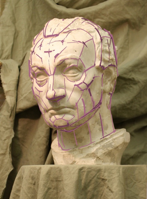Делать это следует в соответствии с планами (плоскостями) и переломами (поворотами) формы головы, которые вы видите. Для этого полезно подойти поближе, внимательно посмотреть с разных сторон.