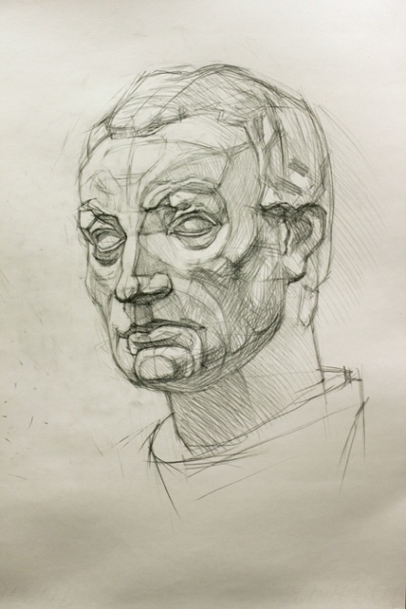 Учебные "обрубовочные" головы следует рисовать много раз в разных поворотах и ракурсах. При этом много длительных набросков по 20-30 минут небольшого (8-12 см) размера с разных точек, дают пользы намного больше чем всего два полноразмерных рисунка в три четверти слева и справа, как это имеет место в некоторых учебных заведениях.