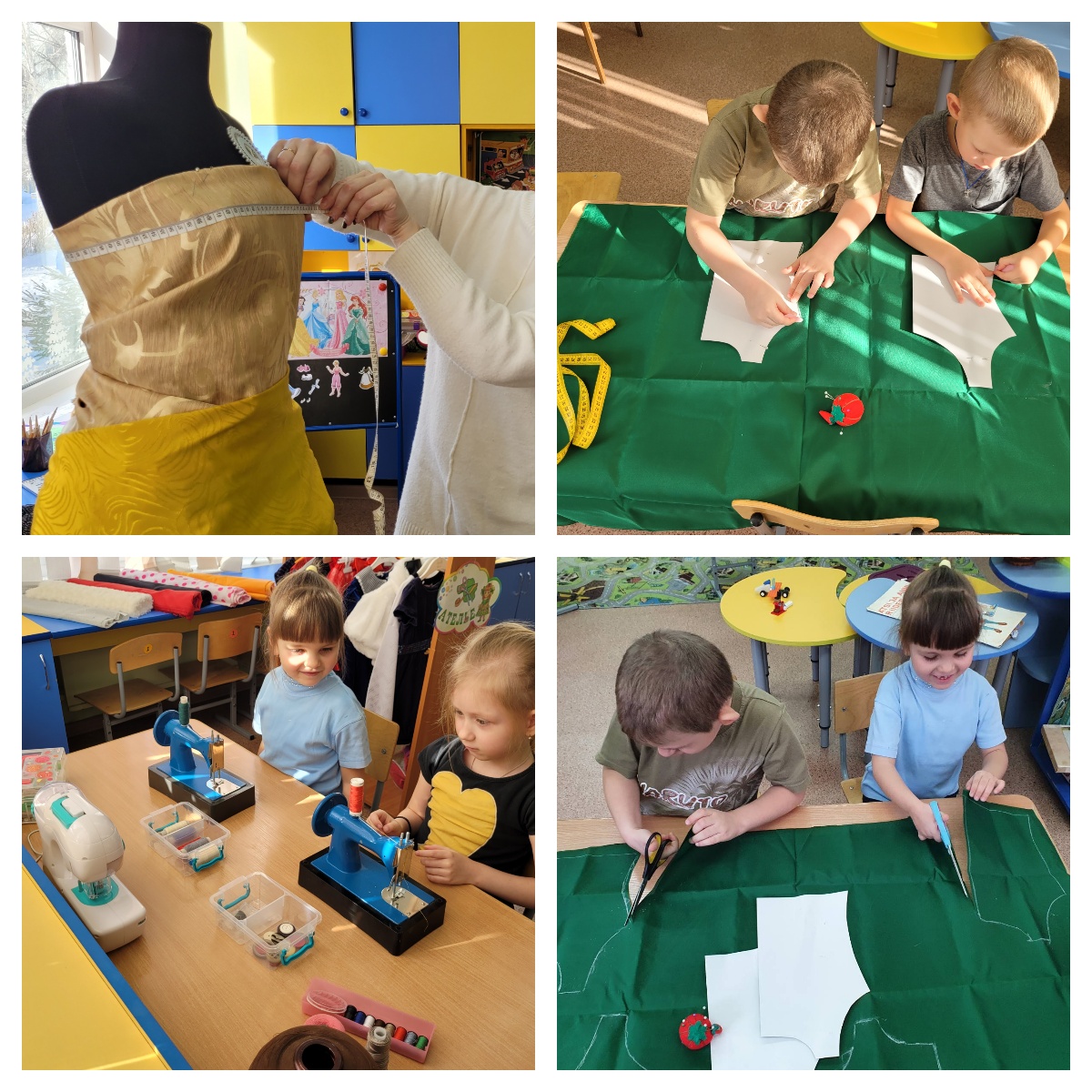 Воспитатель приглашает детей в швейный цех. Спрашивает, кто здесь работает? Ответы детей. Что делают швеи? Ответы детей. Правильно швеи сшивают выкройки из ткани. Несколько детей примеряет на себя роль швеи.