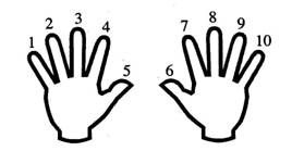 - Поверните обе руки ладонями к себе. Пусть каждый палец по порядку означает соответствующее число: первый слева-1, второй-2, третий-3 ит.д.до 10