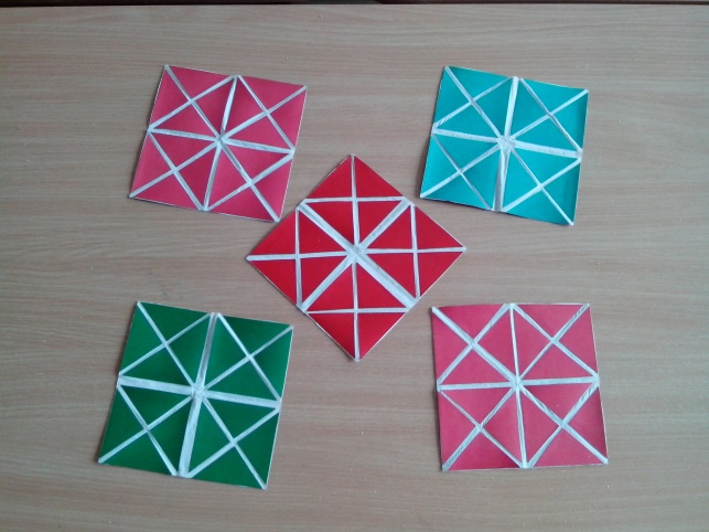 Дети:Положили квадрат красной стороной вверх, верхние уголки загнули вперёд на квадрат. Получился треугольник и прямоугольник.