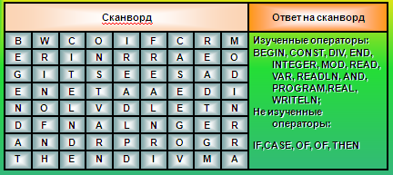 Разгадать кроссворд, включающий термины по теме «Программирование на языке Turbo Pascal»