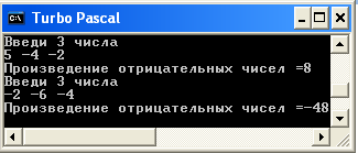 Ввести три числа a,b,c. Определить произведение отрицательных чисел.