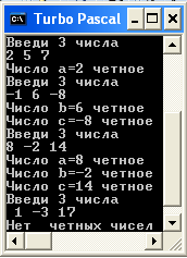 вести три числа a,b,c. Напечатать все четные числа.