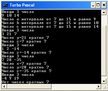 Ввести три числа a,b,c. Напечатать все числа кратные числу 7.
