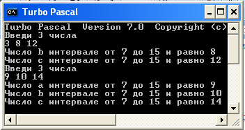 Ввести три числа a,b,c. Напечатать все числа в интервале от 7 до 15.