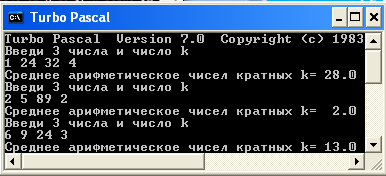 Ввести три числа a,b,c. Найти и напечатать среднее арифметическое чисел кратных заданному числу К.