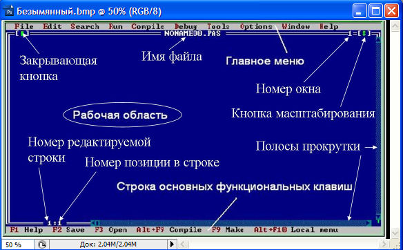 То, что вы видите сейчас на экране и есть интегрированная инструментальная оболочка языка программирования Turbo Pascal 7.0. По внешним признакам её можно разделить на три области.