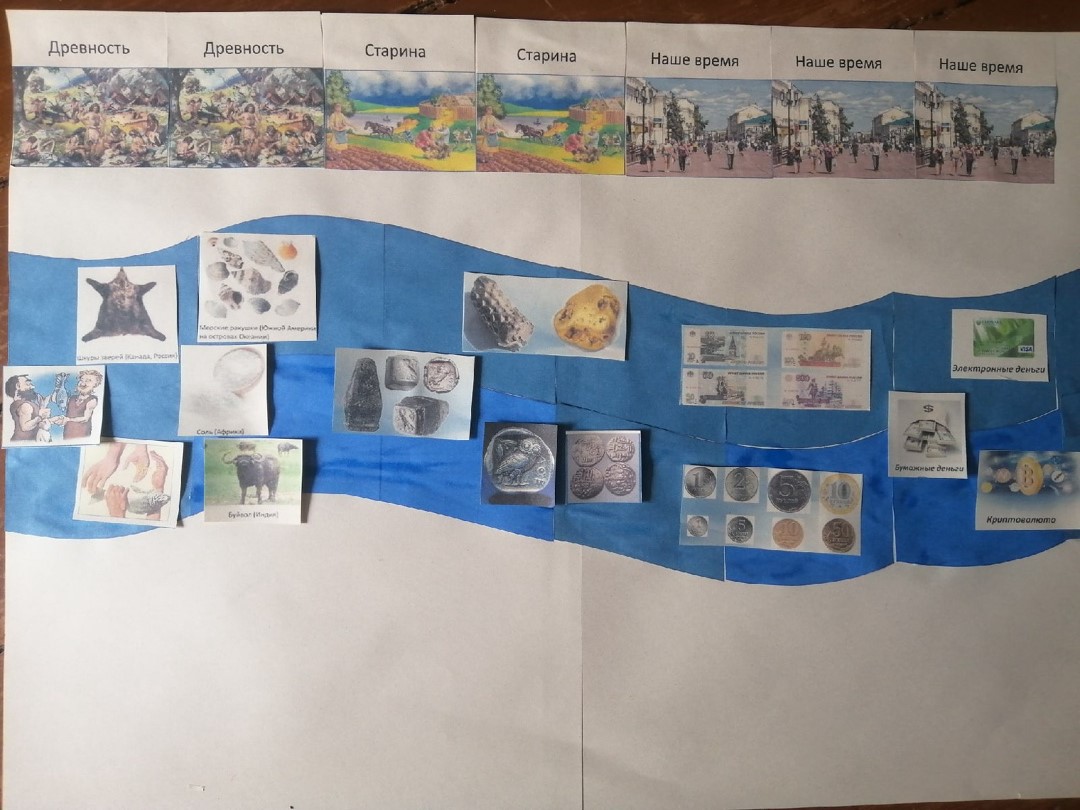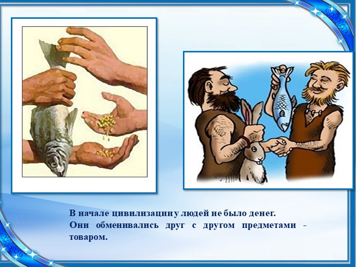 Воспитатель: Было время, когда человечество, еще не знало, что такое деньги. Это был древний мир. Люди просто обменивались полезными