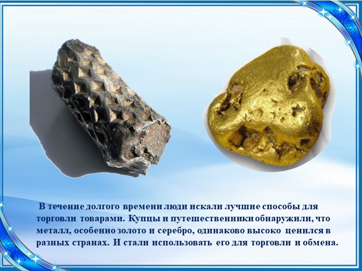 В те времена и изобрели заменитель вещи, на которую будет обмениваться нужный товар - первые в мире деньги. Первые деньги были каменными. Тогда деньги существовали лишь в виде монет разной формы, размера. Деньги могли быть квадратными, удлиненными, полукруглыми и, конечно же, круглыми. Их можно было не только держать в кошельке, но и носить на шее. Деньги изготовляли из драгоценных металлов золота, серебра, делали медные, бронзовые монеты. И рисунок наносили на монетки, какой угодно. Но это были драгоценные металлы и люди стали чеканить деньги из метала.