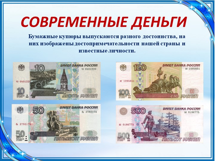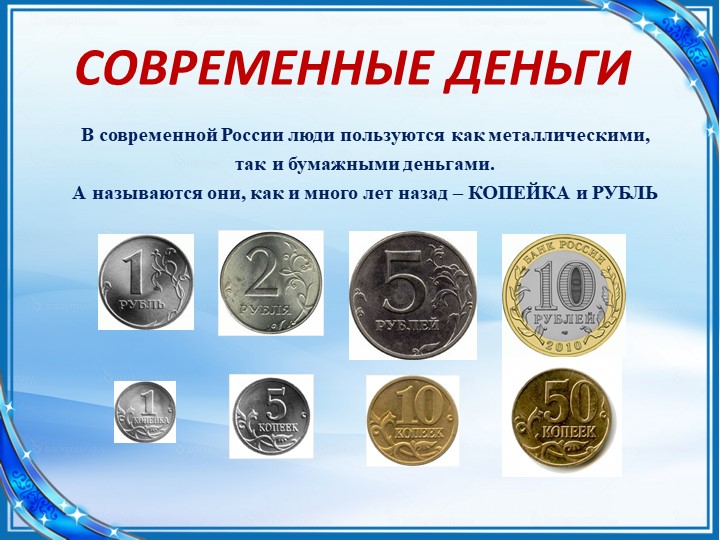 Воспитатель: Мы знаем, что в каждой стране есть свои деньги. Называются они по-разному. Как в нашей стране называют деньги?