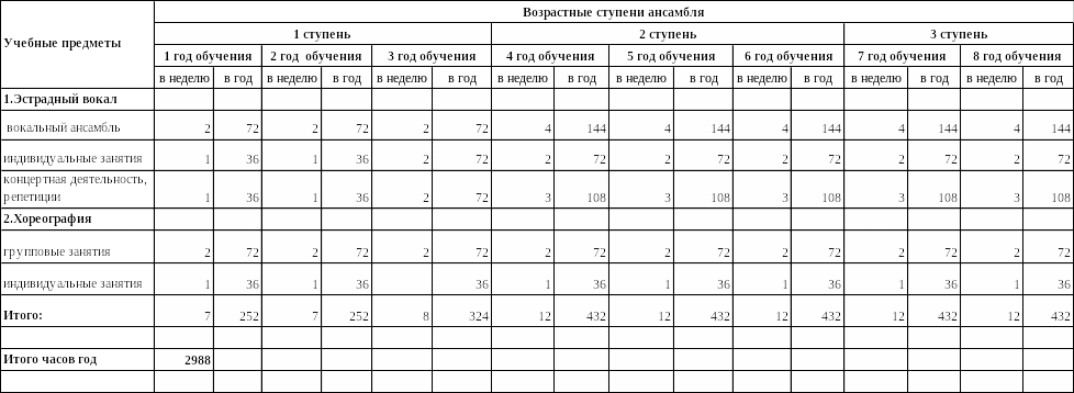 Продолжительность занятия 1 учебный час (45 минут), от 1 до 6 часов в неделю, в зависимости от возрастной группы и подготовки к мероприятиям.