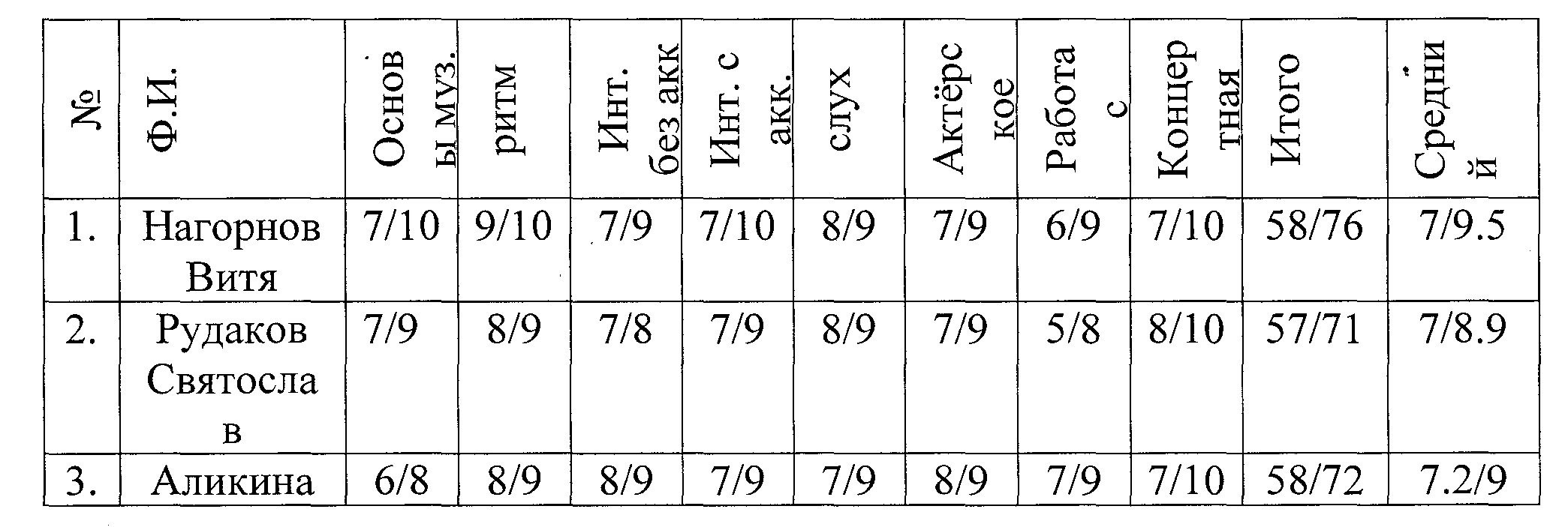 № | Ф.И. | Хореографические данные | Ритм и музыкальность | ориентировку в пространстве: | Выполнение усложнённых комбинаций танца | Концертная деят. | Терминология | Актёрское мастерство | Внимание память | Итого | Средний процент роста |