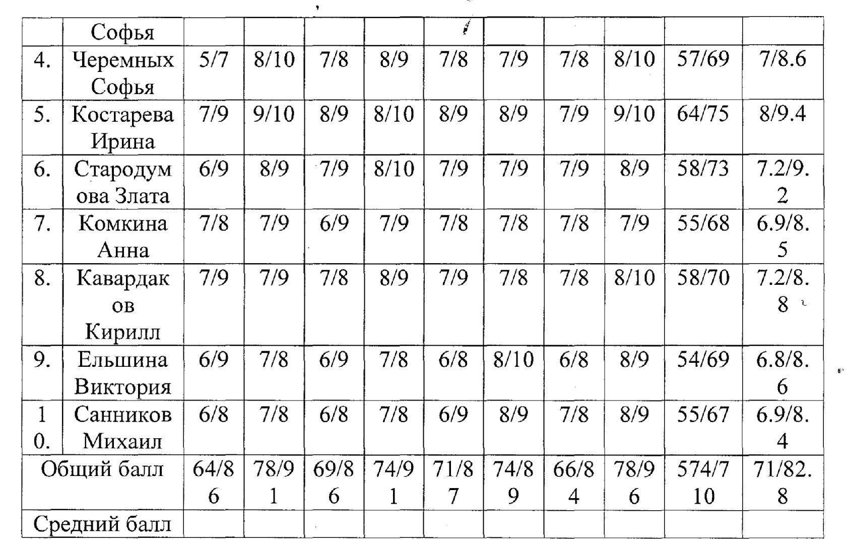 9. | Новикова Ксения | 9/10 | 8/9 | 8/9 | 6/7 | 8/9 | 8/8 | 8/9 | 5/6 | 64/71 | 10% |