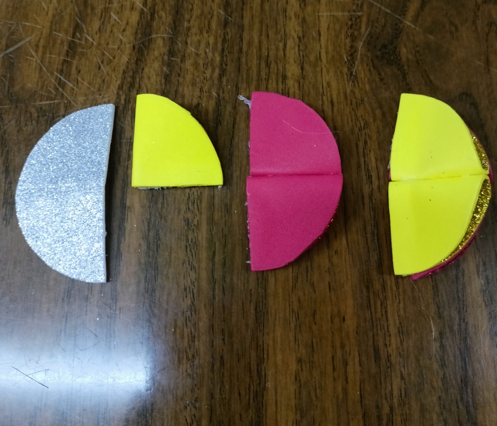 Подготовив все необходимы элементы, нагрейте клеевой пистолет до нужной температуры.Складываем детали и склеиваем. Если, что-то склеилось не ровно, можно ножницами подровнять. У нас должно получиться по 14 четвертинок каждого цвета