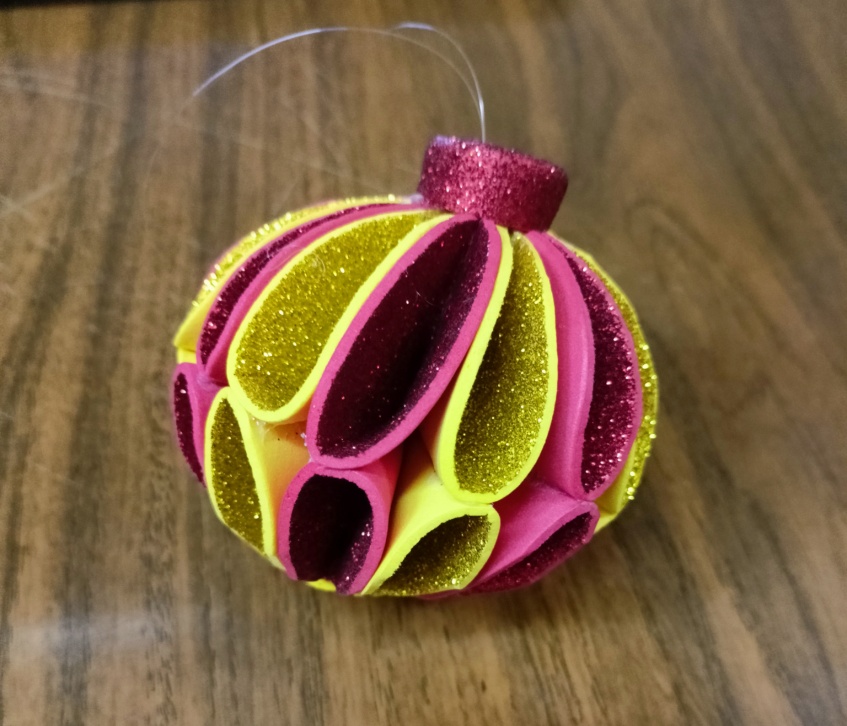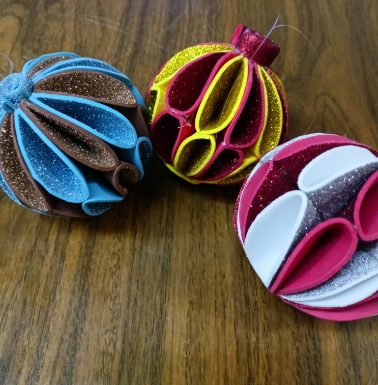 Используемые материалы: фоамиран с блестками, ножницы, клеевой пистолет, карандаш, заготовки для шарика, леска, готовые поделки для образца.