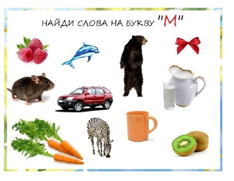 Логопед:- Я раздам каждому картинку, если в слове есть звук [М] дарим корове:малина, дельфин, мишка, бант, молоко, чашка, киви, зебра, морковь, мышь.
