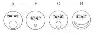 Логопед выставляет перед детьми символы звуков А-О-У-И, поочередно показывает на тот или иной символ звука, дети индивидуально называют соответствующий звук.
