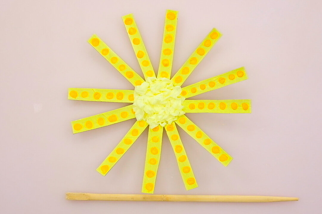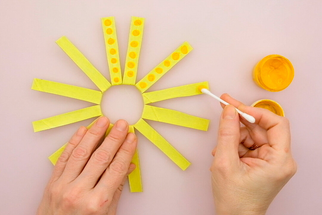 При помощи ватных палочек декорируем лучики точками тёмно-жёлтой краски.
