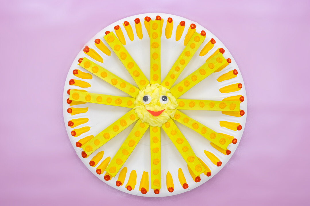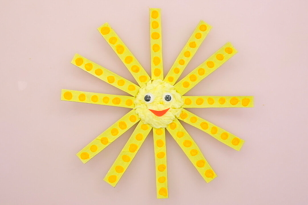 Затем ватными палочками отпечатаем красные кружки, так как показано на фото. Приклеим в центр солнышко и поделка готова.