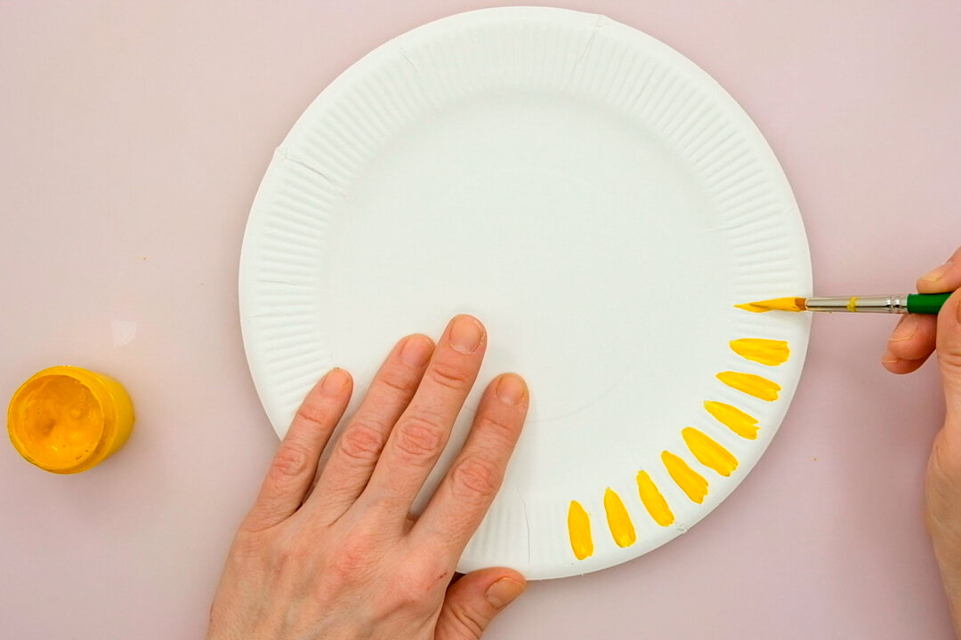 Возьмём бумажную тарелку и задекорируем край, нанося отпечатки кистью наполненной жёлтой краской.
