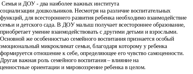 Период дошкольного детства выступает благоприятным периодом для воспитания нравственных качеств личности, приобщения к ценностям национальной культуры, воспитания толерантности, уважения к другим культурам. Система ценностей дает возможность личности решить, что для нее значимо и важно в жизни. Ребенок-дошкольник как губка впитывает все те нормы, правила поведения, которые предлагает ему окружающая макро и микросреда. И от того каким содержанием мы наполним предлагаемые для усвоения нормы, правила и ценности зависит ход дальнейшего развития ребенка. Проблемы семейного воспитания и развития семьи очень значимы и многоаспектны, и современное дошкольное образование не может не учитывать роль семьи в процессе детского развития.